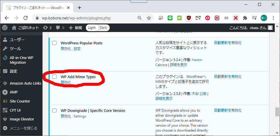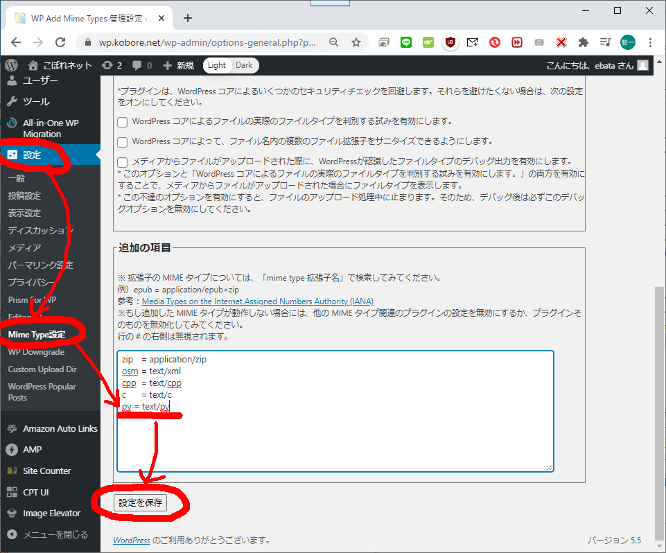 で、昔なんかやったことがあるな、と思い出しながら、「WP Add Mime Types」というプラグインをインストールしたのを思い出しました。