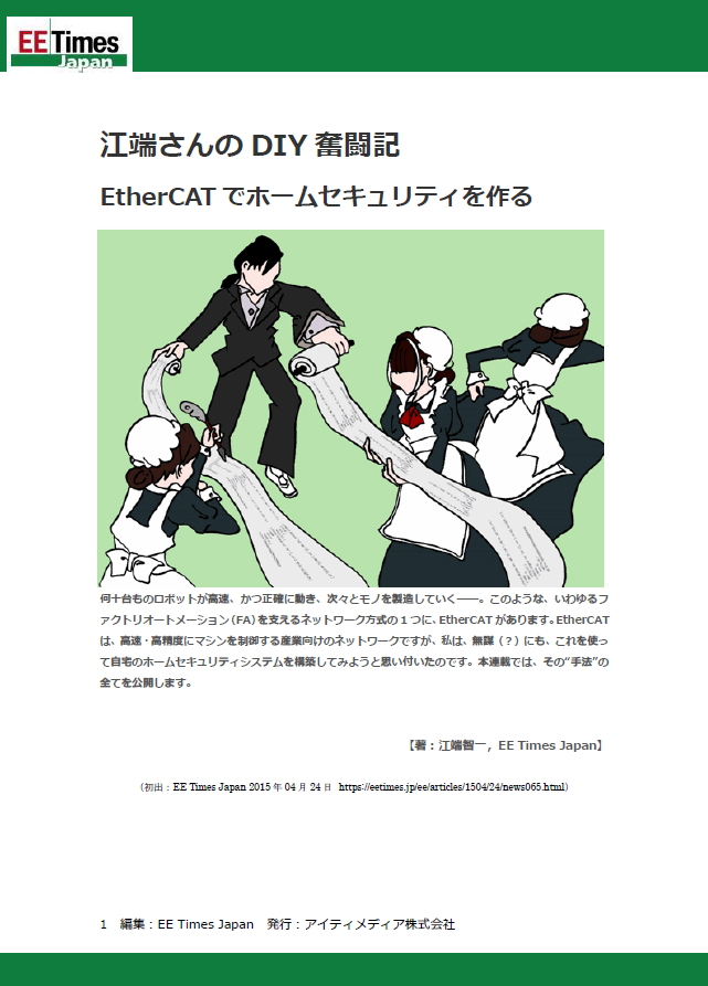 江端さんのDIY奮闘記 ~EtherCATでホームセキュリティを作る~2021年5月31日https://eetimes.itmedia.co.jp/ee/articles/1909/28/news006.html 2021年5月31日2021/05,江端さんの技術メモPosted by ebata