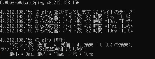 ところが、会社のシステムに繋っているセキュアPC(SPC)に関しては、メールの送信ができました。で、SPCから、kobore.netのIPアドレスを入手して、自宅PCのコマンド画面からpingを打ってみました。