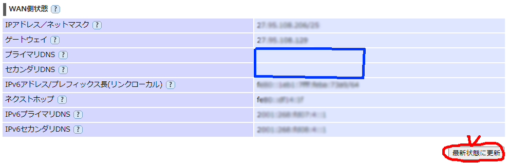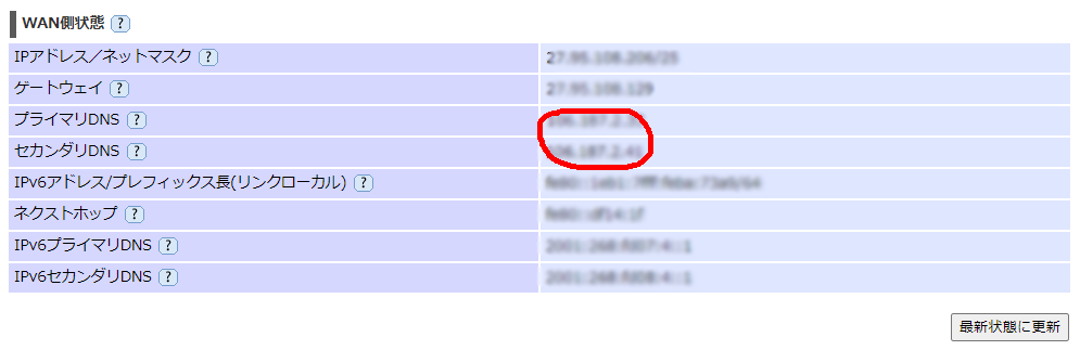 やはりDNSの表示が出なくなっている。「最新状態に更新」を押しても改善なし。