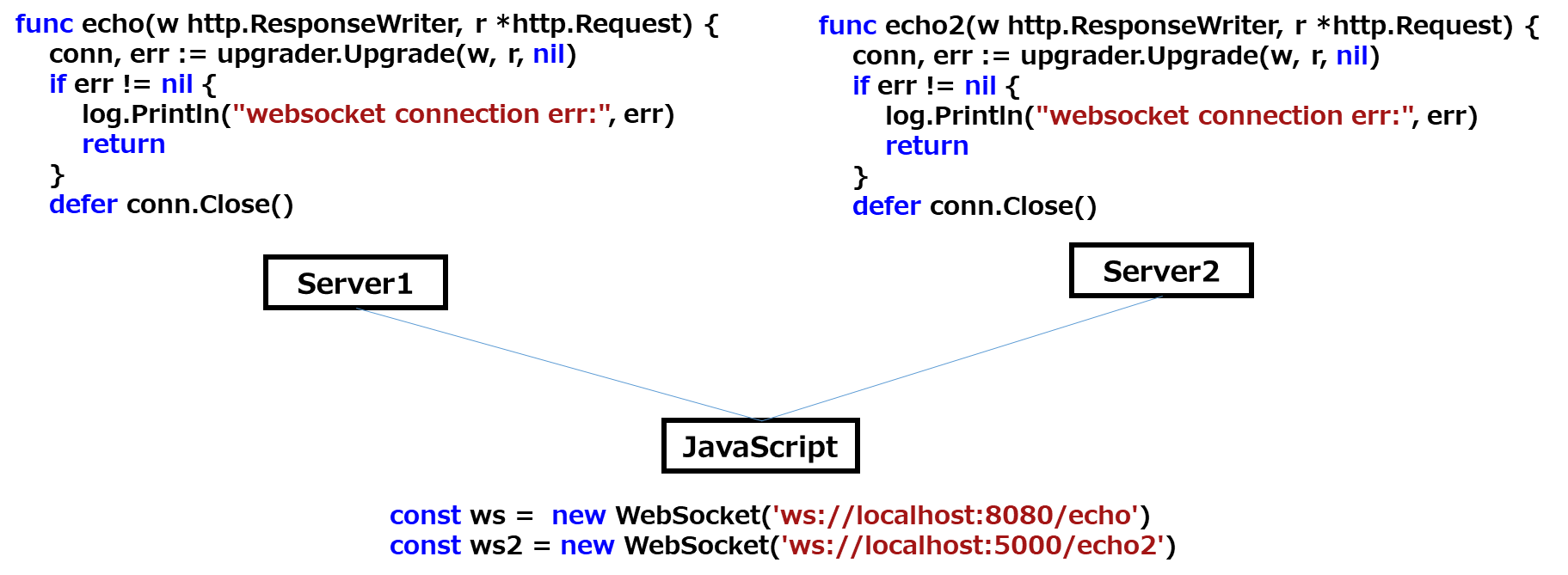 1つのJavaScriptに2つのWebSocket繋げようとしたのですが、upgrade:websocket: request origin not allowed by Upgrader.CheckOrigin というエラーメッセージがでてきて、コネクションに失敗します。