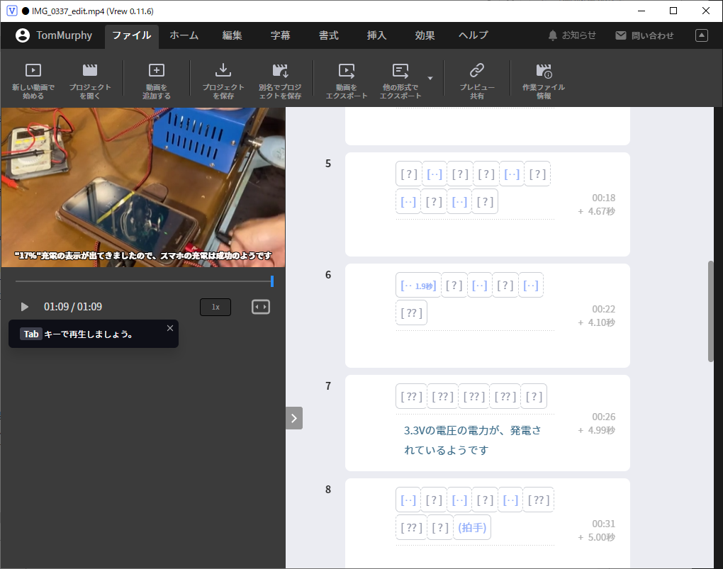ちなみに、今回は、テロップ作りに、Vrewというソフトウェアを試してみました。