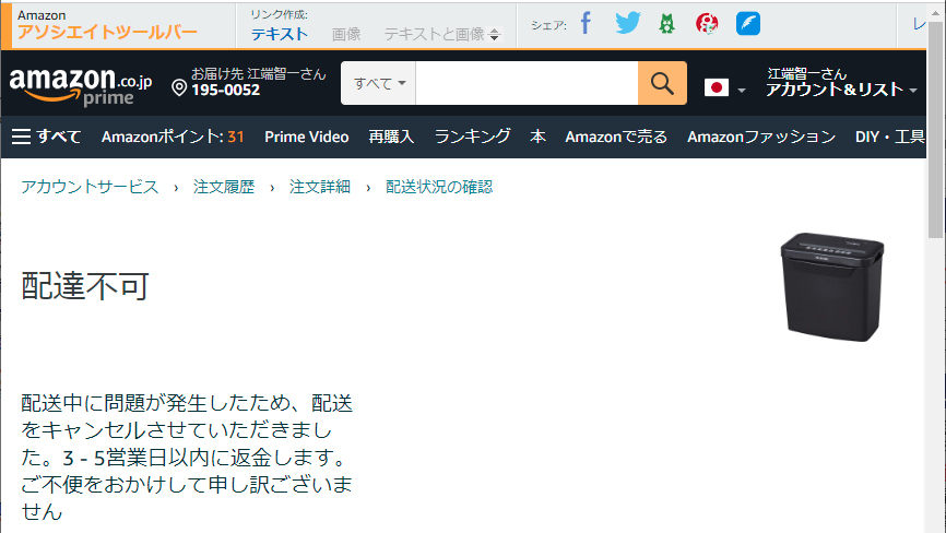 Amazon は、時々、「配送不可」といい、「キャンセル」し「返金を完了する」ということをします―― 理由の説明もなく、です。