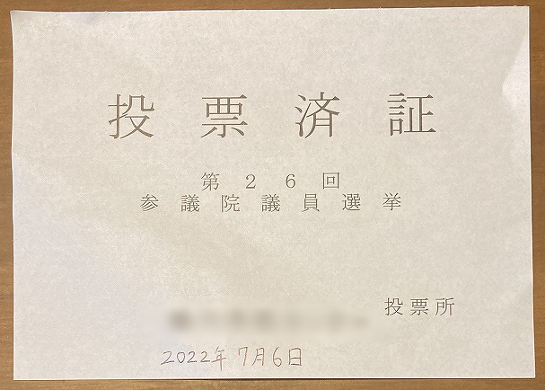 第26回参議院議員選挙の投票済書を貰ってきました。