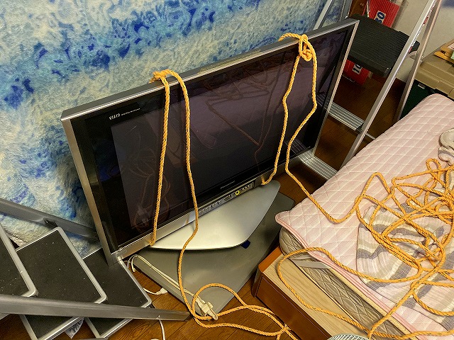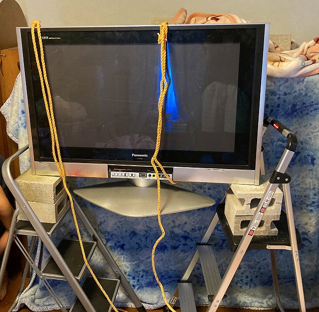 高い位置でテレビを支えられるよう、ロープで両端を縛って、脚立の上に、片方づつ引っ掛けて上げていきました。