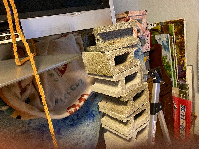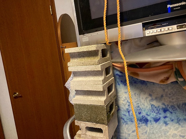 私の案出した方法は、極めて原始的な方法です ―― 『コンクリートブロックを詰み上げながら、テレビをリフトアップする』です。