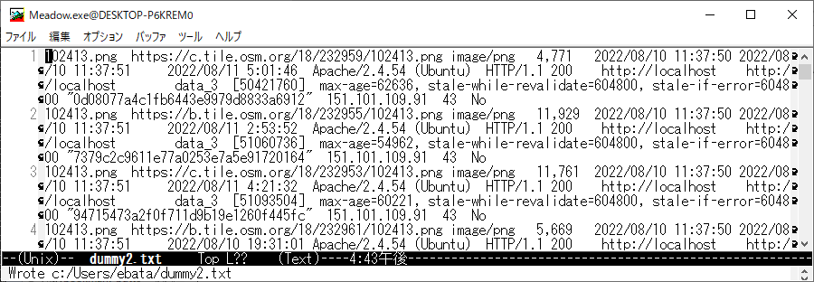 で、tile.osm.org の部分のファイルだけを取り出せればよいのですが、(今のところ、私には、見つけられていません)ので、"Edit" → "Select All" で全部のテキストを取り出して、適当にファイルをぶった切って、取り出すことにしました (良いやり方があったら、私に教えて下さい)。