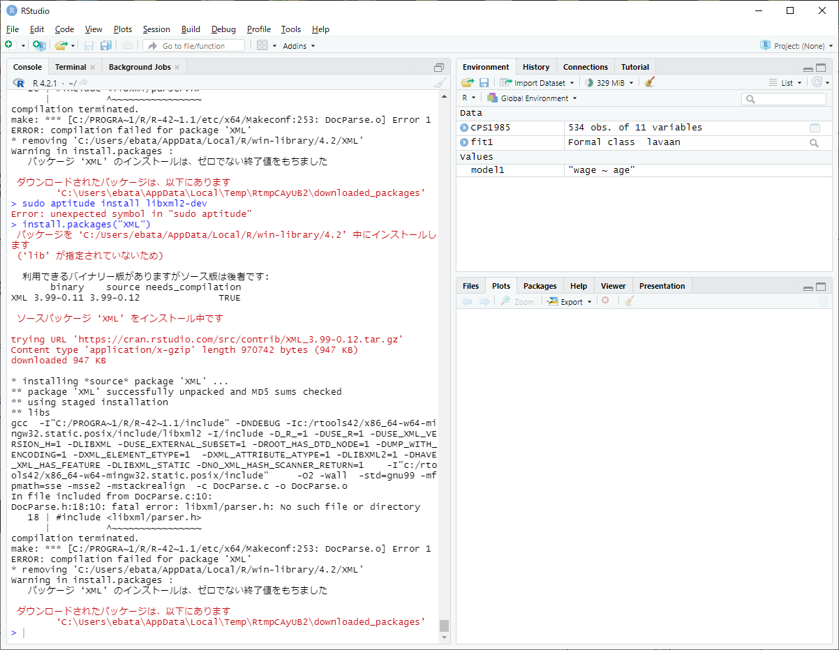 パッケージ 'XML' のインストールは、ゼロでない終了値をもちました