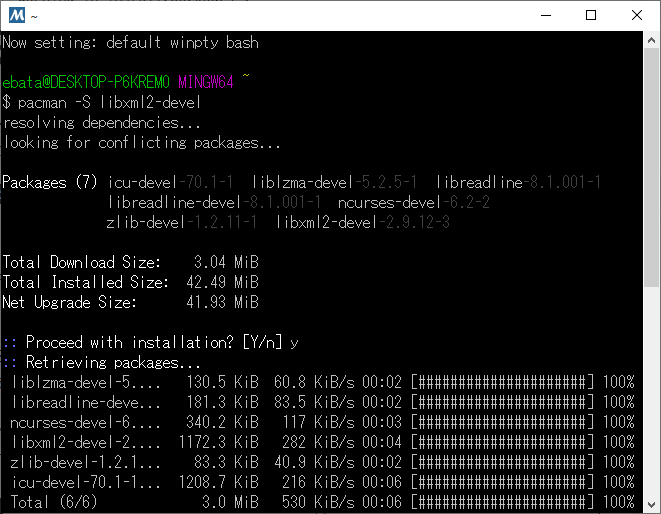 ですね。 MSYS2から、pacmanで libxml2-devel のインストールを試みています。