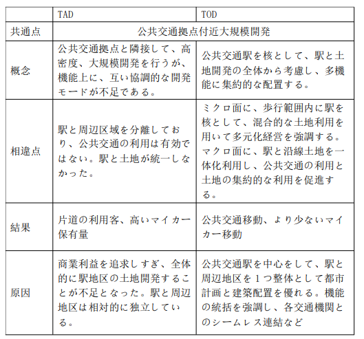 TOD, TAD2023年1月20日公共交通指向型開発(TOD: Transit Oriented Development) - 公共交通機関に基盤を置き、自動車に依存しない社会を目指した都市開発。 「交通隣接型開発」(TAD:‘transit-adjacent development’) 公共交通拠点と隣接して、高密度、大規模開発を行うが、機能上に、互い協調的な開発モードが不足である。 2023年1月20日2023,江端さんの技術メモPosted by ebata