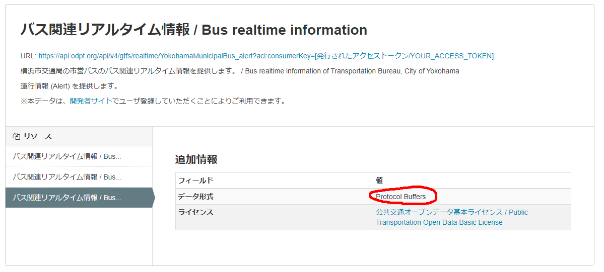 URL: https://api.odpt.org/api/v4/gtfs/realtime/YokohamaMunicipalBus_vehicle?acl:consumerKey=[発行されたアクセストークン/YOUR_ACCESS_TOKEN]
