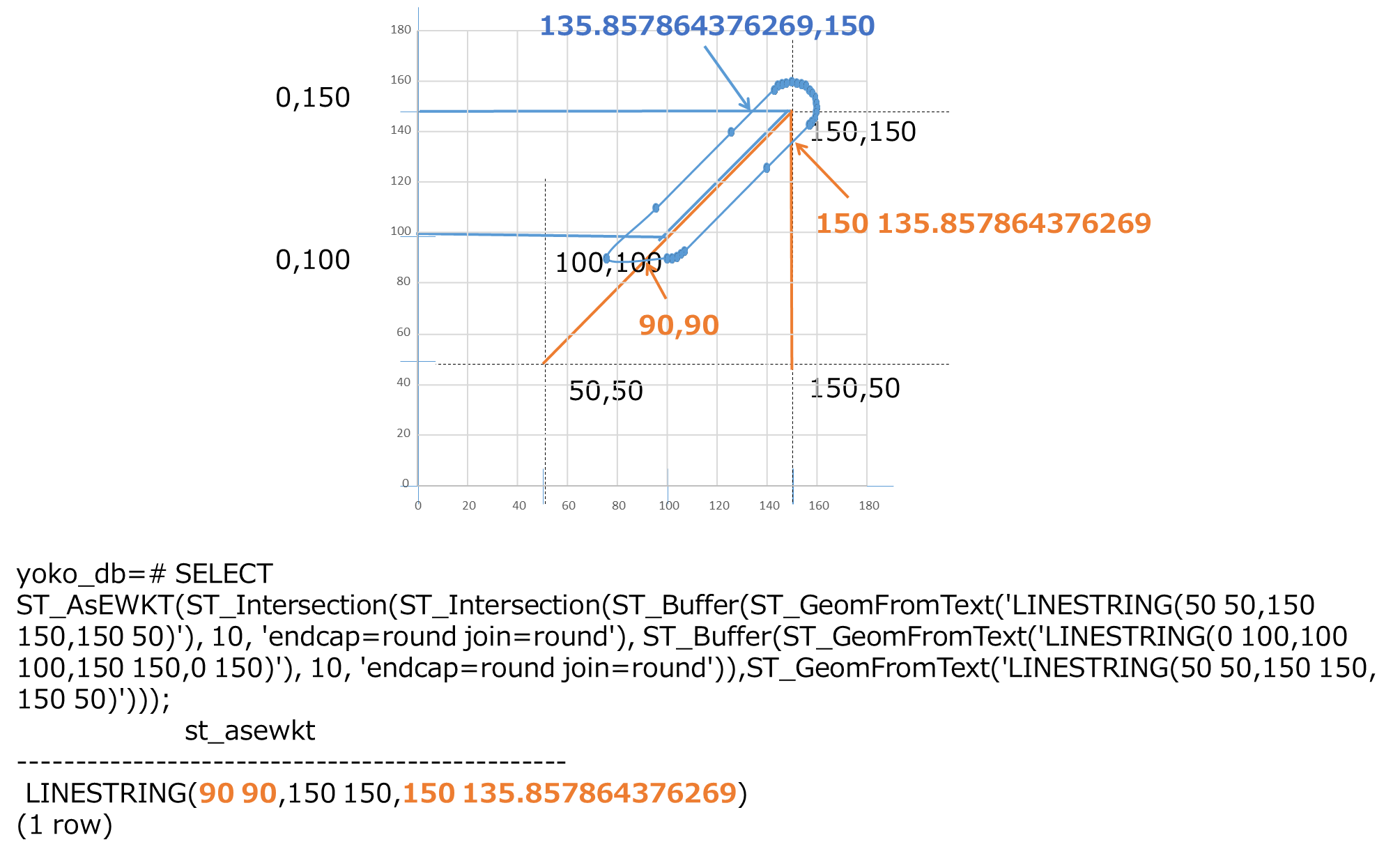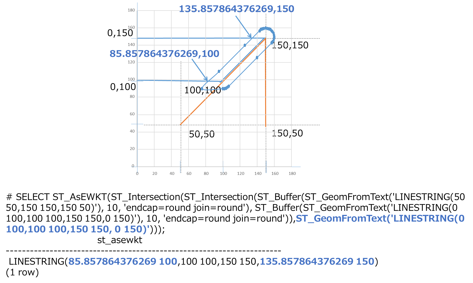 # SELECT ST_AsEWKT(ST_Intersection(ST_Intersection(ST_Buffer(ST_GeomFromText('LINESTRING(50 50,150 150,150 50)'), 10, 'endcap=round join=round'), ST_Buffer(ST_GeomFromText('LINESTRING(0 100,100 100,150 150,0 150)'), 10, 'endcap=round join=round')),ST_GeomFromText('LINESTRING(0 100,100 100,150 150, 0 150)')));