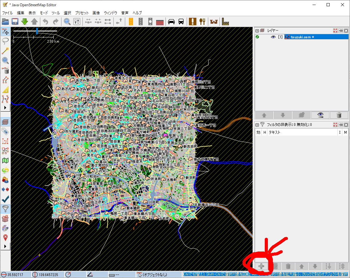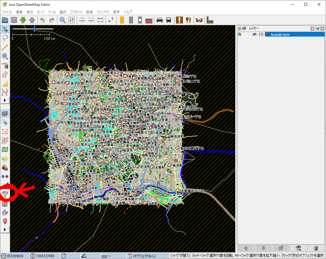 JOSMを立ち上げる → osmファイルをドラッグする → 下の図の赤丸の部分をクリックする