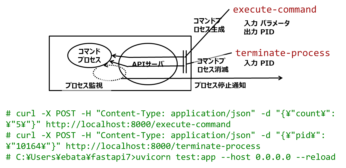 コマンドを起動して、必要に応じて停止させ、プロセスID(PID)が消えるまでを監視するfastapiのプログラム
