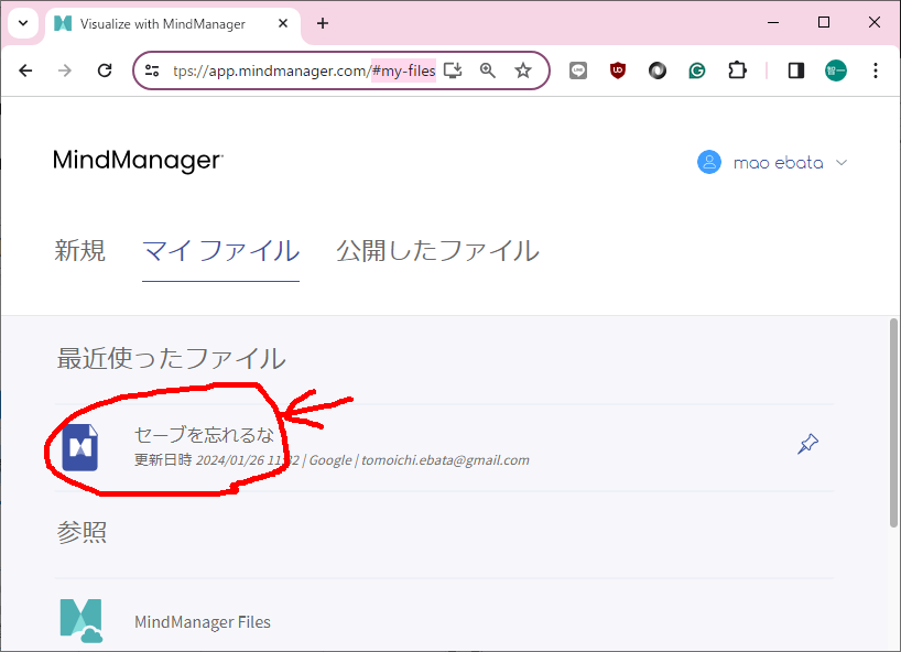https://app.mindmanager.com/ と入力(#my-filesはつけない)