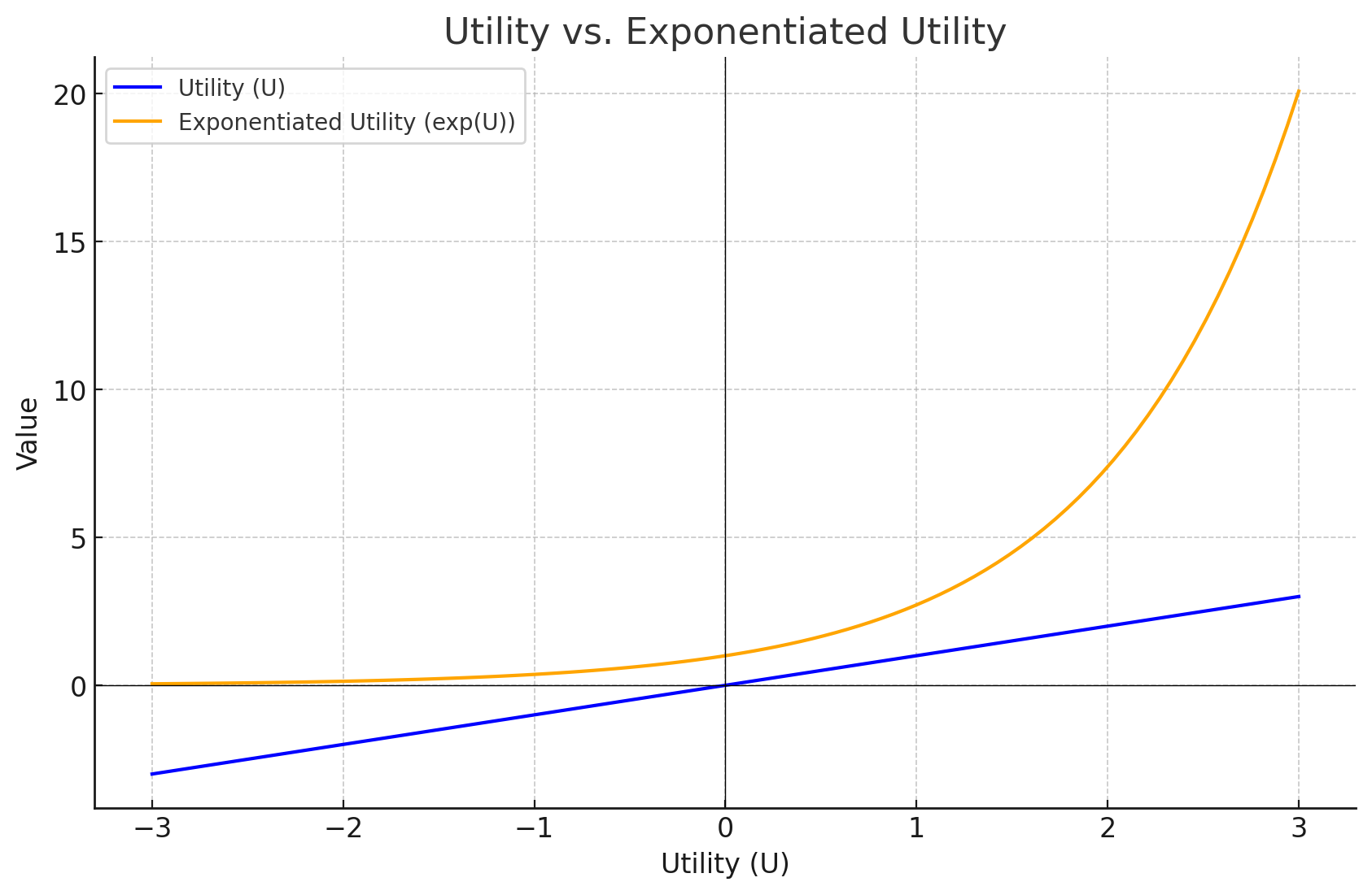 この図は、効用(Utility)とその指数関数値(Exponentiated Utility)の関係を示しています。