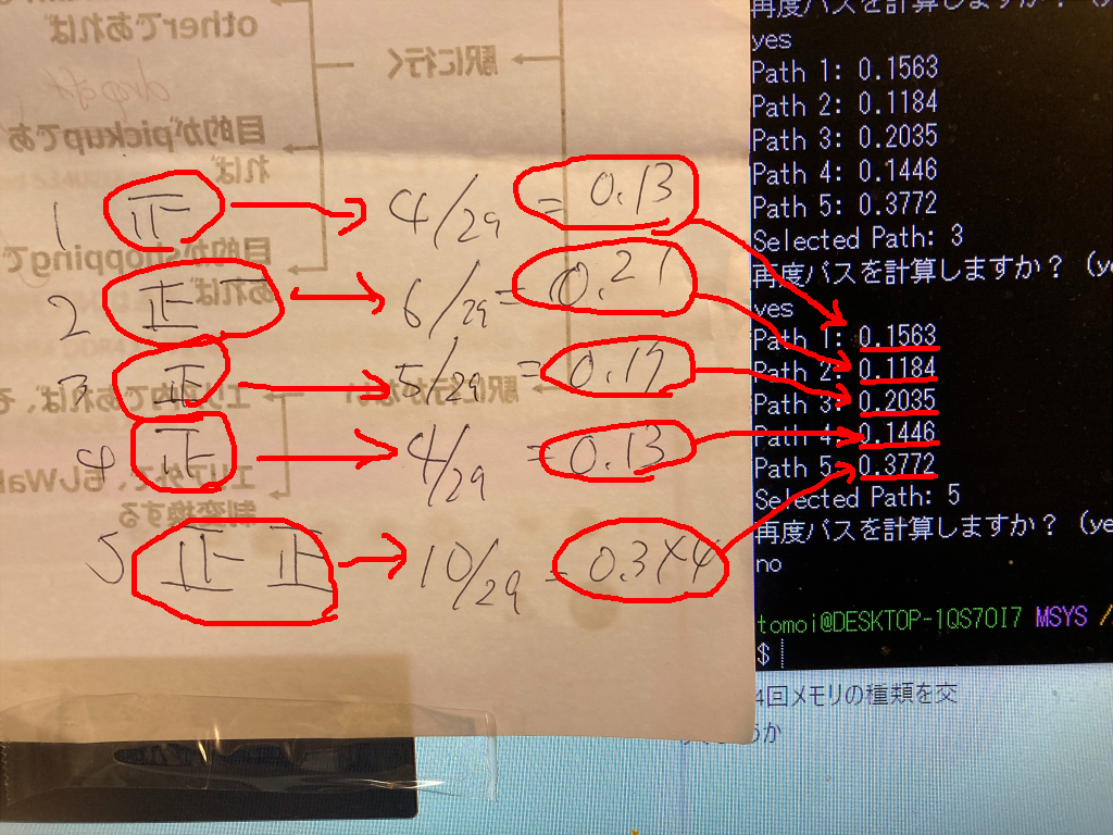 確率算出ルーチンの手動検証のリアル2024年8月24日29回ほど手動で回して、確率アルゴリズムの検証をしました。 まあ、正しく動いているようです(検証用ルーチン作るのが面倒だった)。 2024年8月24日未分類Posted by ebata