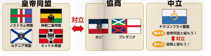 - 皇帝同盟: 実際の歴史においては、ドイツ帝国を中心とする中央同盟国(同盟国側)が該当します(ドイツ、オーストリア=ハンガリー、オスマン帝国など)。