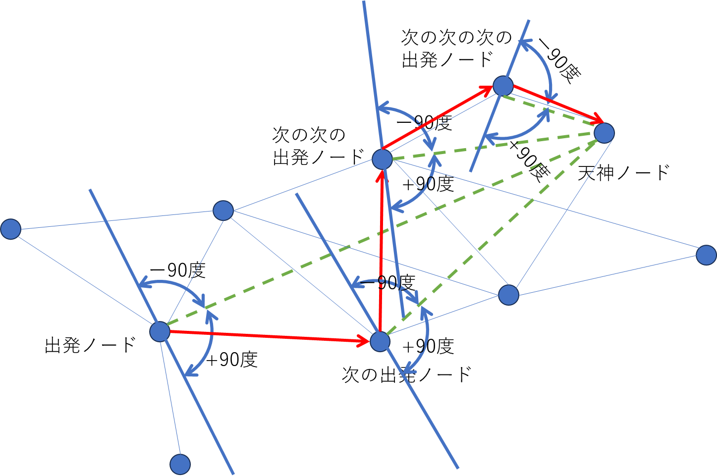 (Step.4) 出発ノードと天神ノードを直線で繋いで、出発ノードから-90度から+90度の範囲のノードを一つ選ぶ