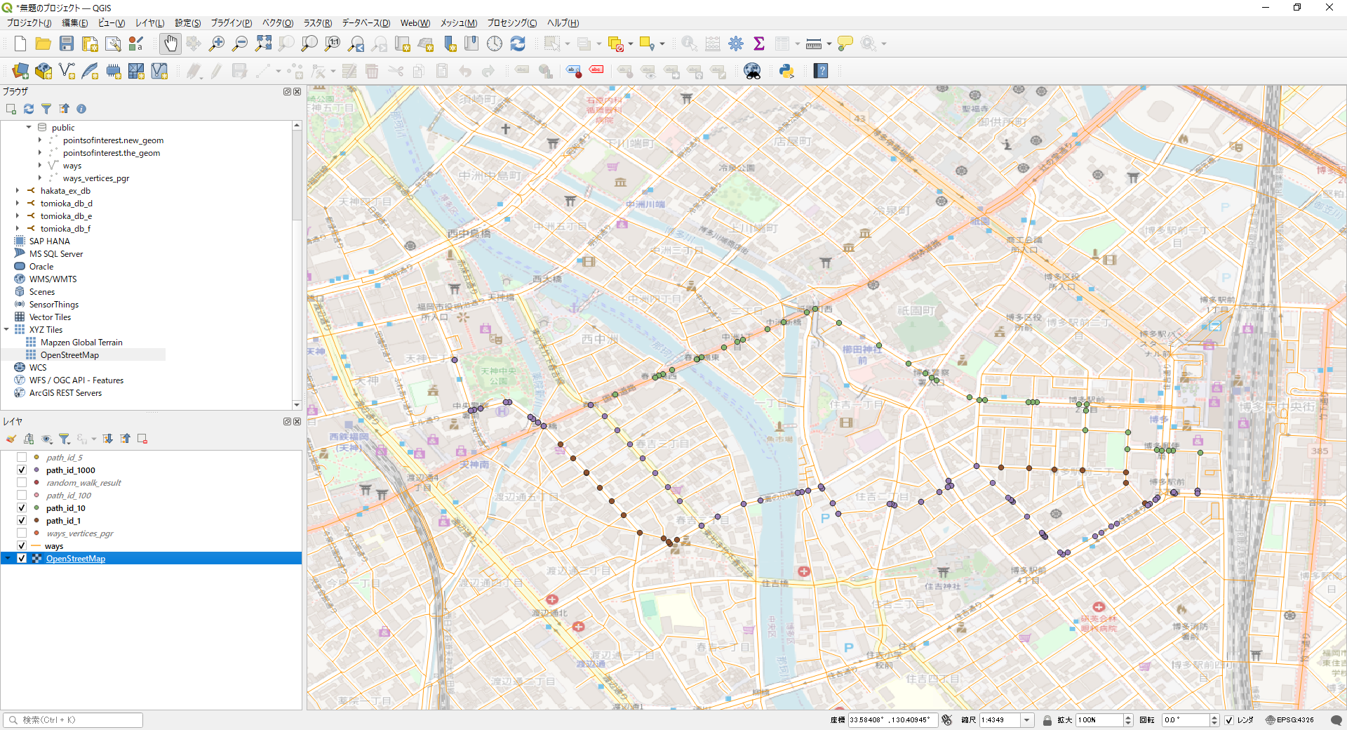 上記のDBはpostGISで構成されており、ways, ways_vertices_pgr があり、SQLでダイクストラ計算が行えます。