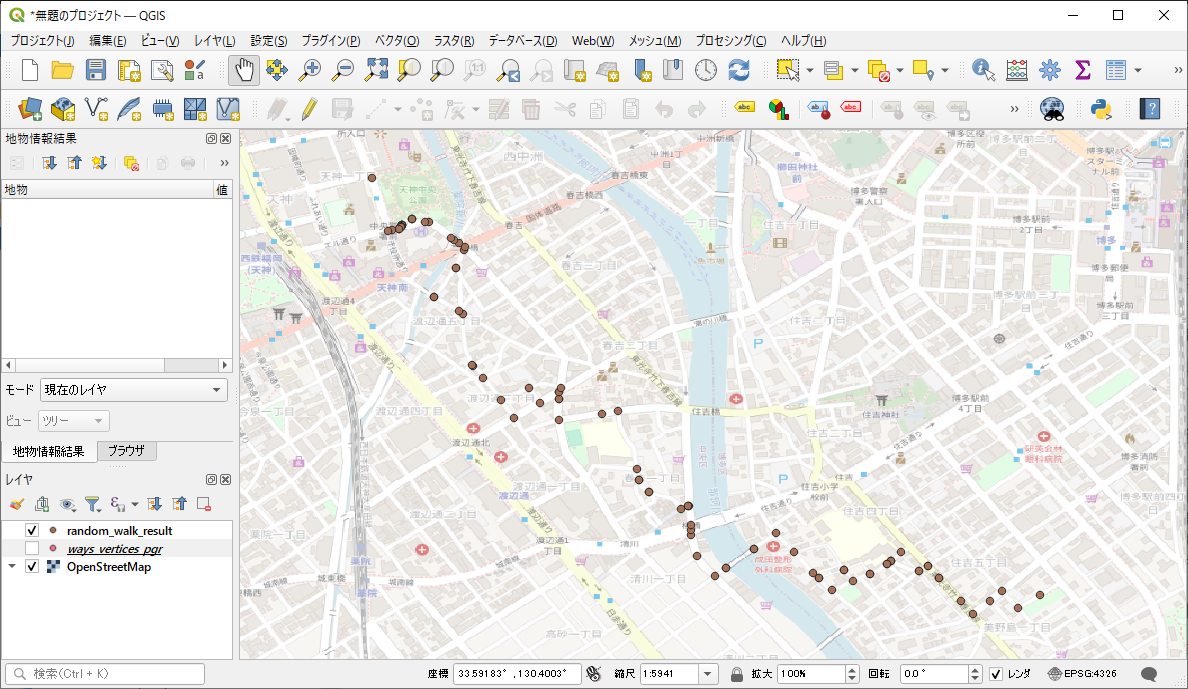 出発ノードと目的ノード(天神駅に近いノード)を設定し、データベース上のノード間をランダムに移動しながら、最終的に目的ノードに到達する経路を記録します。