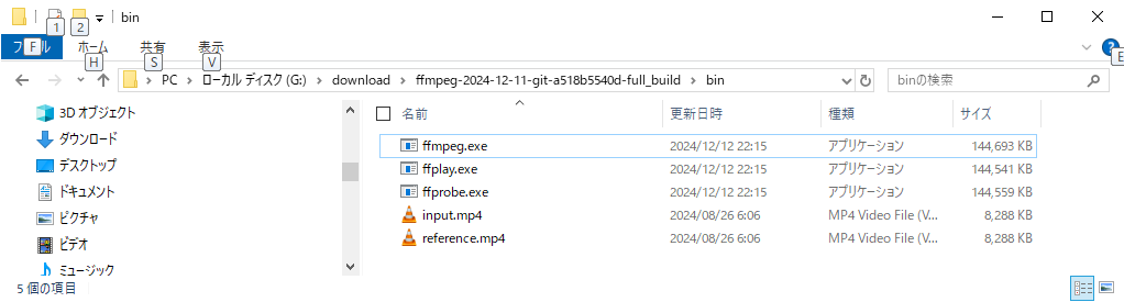 ダウンロードして展開した場所の内部で(パスが通っていない)ffmpegを実行