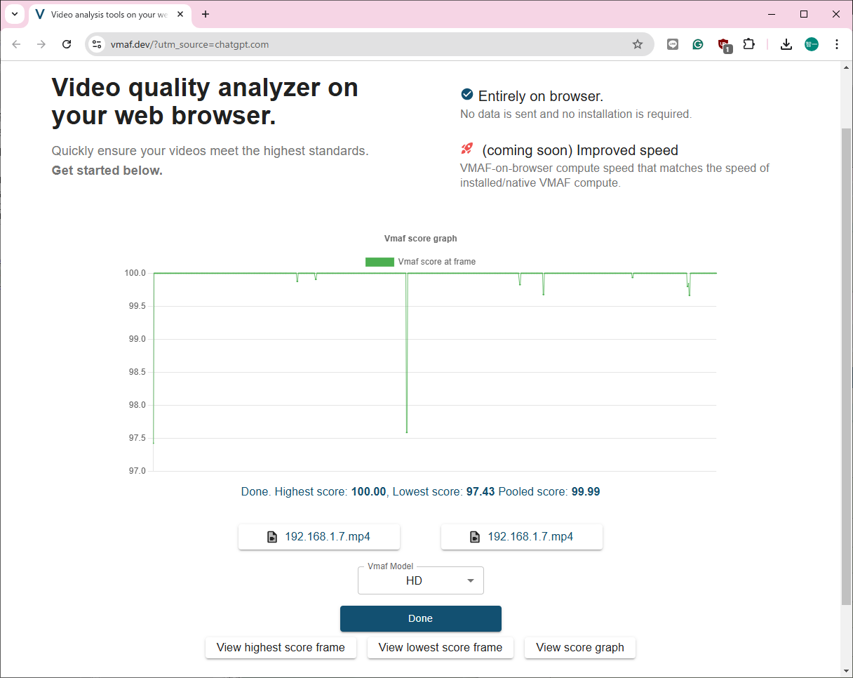 [Parsed_libvmaf_0 @ 00000226c63e6640] VMAF score: 99.992967e=N/A speed=1.57x