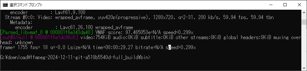 処理速度を示しています。speed=0.299xは、処理がリアルタイムの29.9%の速度で進行したことを意味します。この低速さは、VMAF計算が非常に計算集約的であるためです。