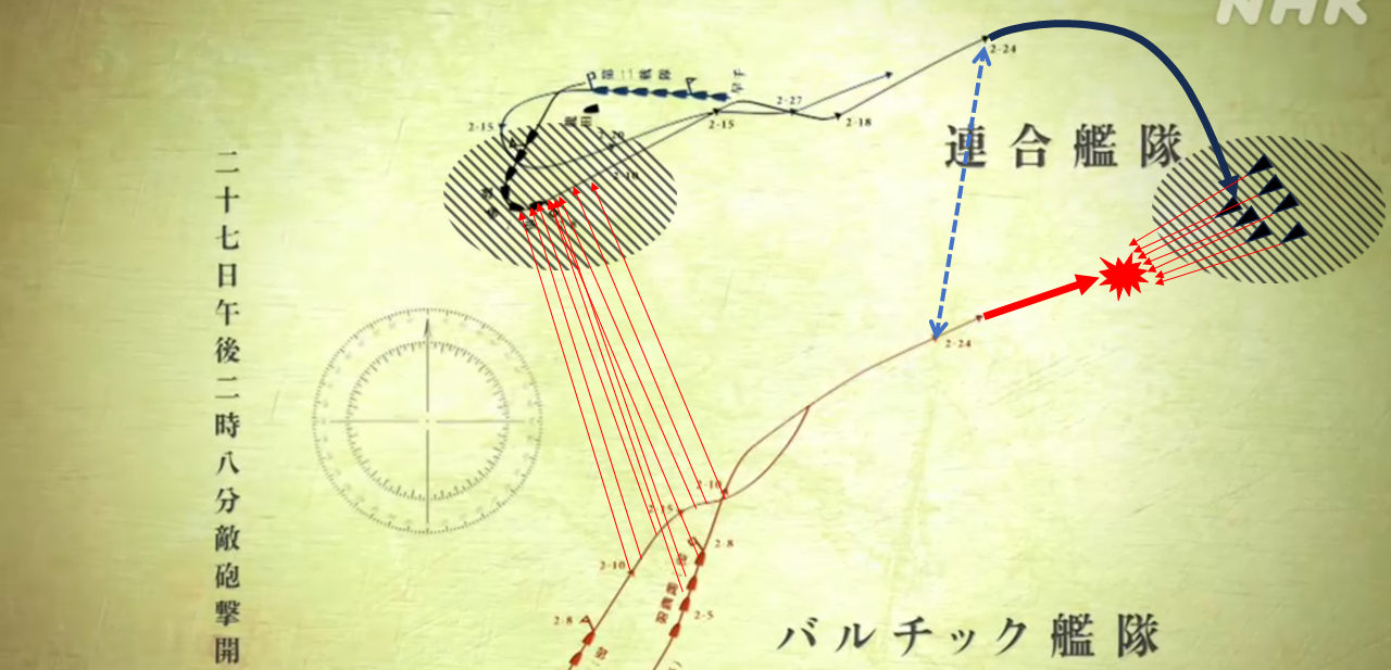 (3)一列になったロシア艦隊を、ひとつづつを、一斉砲撃で潰す