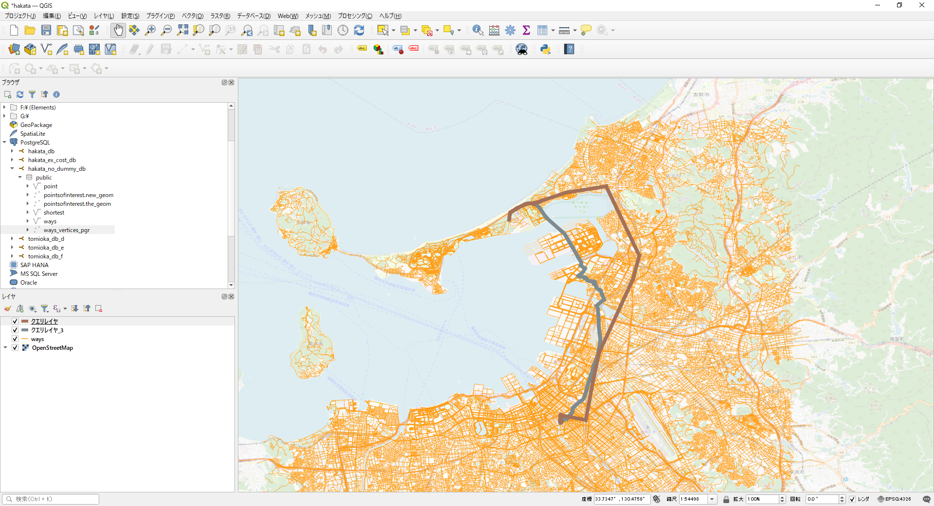SELECT seq, node, edge, cost, agg_cost FROM pgr_dijkstra('SELECT gid as id, source, target,length_m as cost FROM ways',66619, 92554, false);