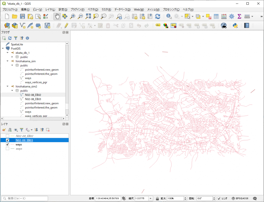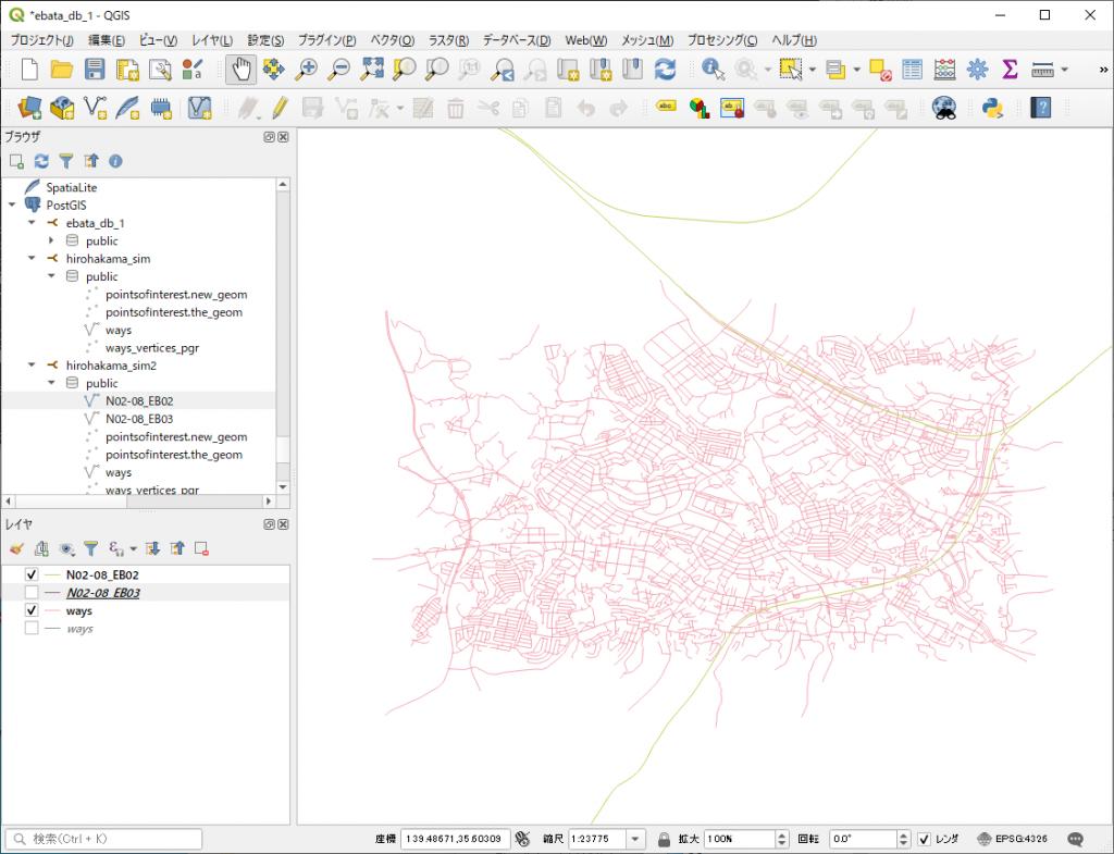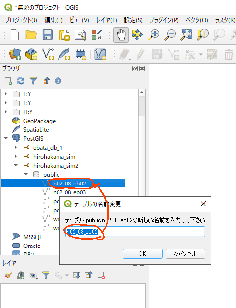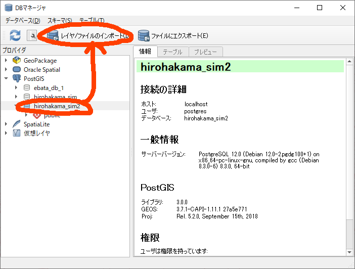 (どういう訳か、shp2pgsqlがなくて、apt-get install shp2pgsql にも失敗するので)、QGIS3を使って、PostgresのDBにつっこむ。