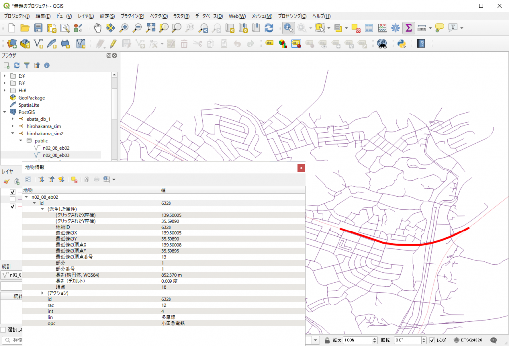 hirohakama_sim2=# select ST_Length(Geography(ST_Transform(geom,4326))) from n02_08_eb03 where id = 3106;
