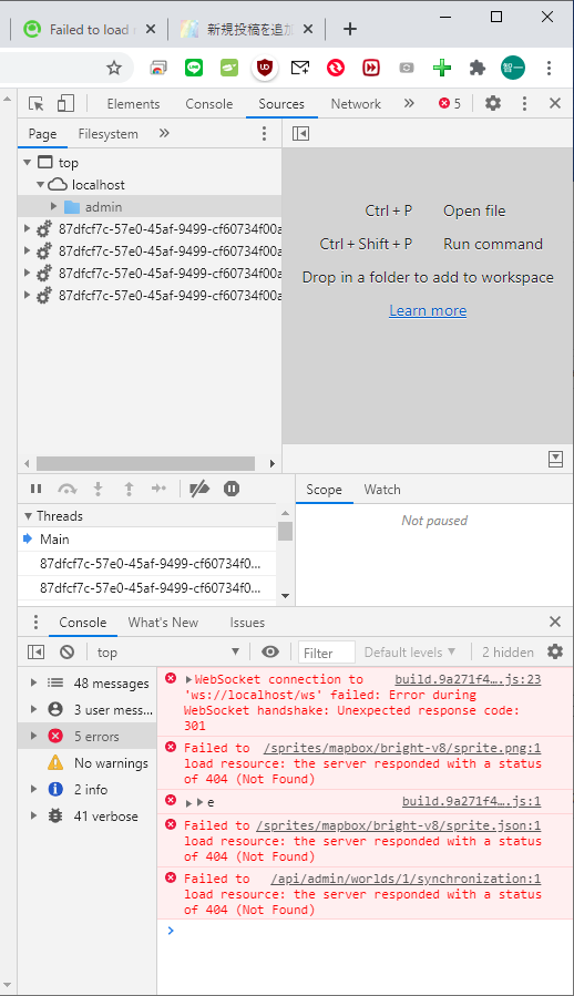 WebSocket connection to 'ws://localhost/ws' failed: Error during WebSocket handshake: Unexpected response code: 301