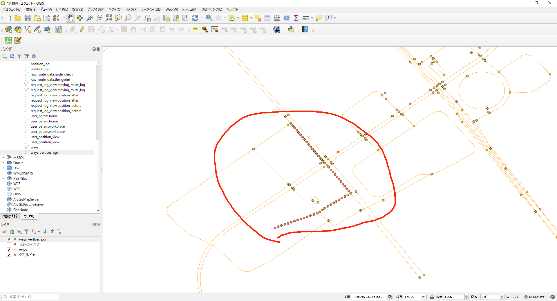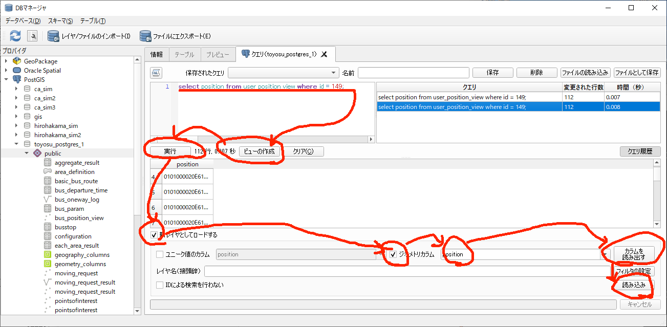 ca_sim=# select user_id, ST_AsText(position_before) from request_log_view where st_dwithin(position_before, st_geomfromtext('POINT(139.79652749 35.65457592)', 4326), 0.03233394 / 3600 * 300);