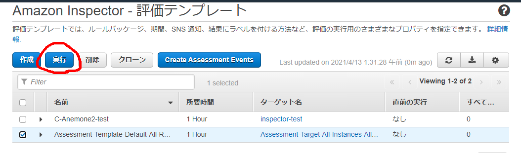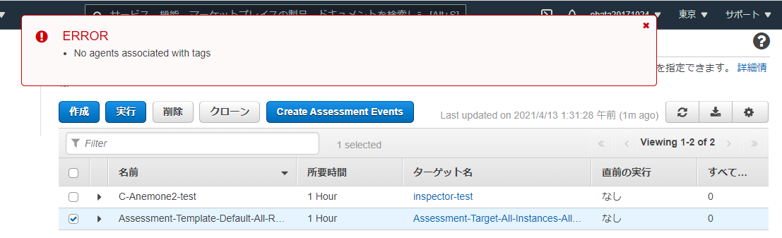 その後、AWS マネジメントコンソール から、inspector を選んで、