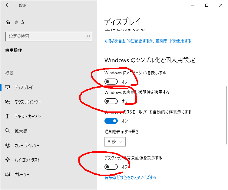 • 「スタートメニュー」→「設定」→「簡単操作」→「その他のオプション」→「Windowsでアニメーションを再生する」→「オフ」