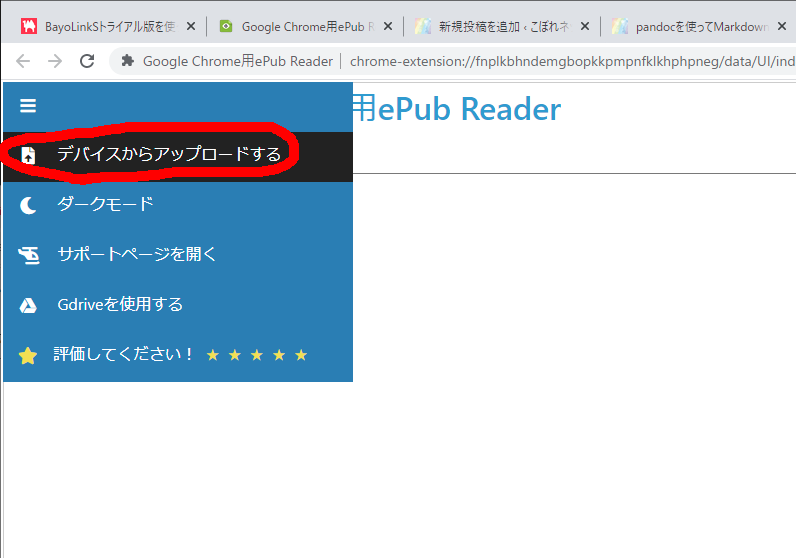 を実行して、chromoの拡張機能としてアドインしておいた、epubリーダを使って"book.epub"を表示したら、