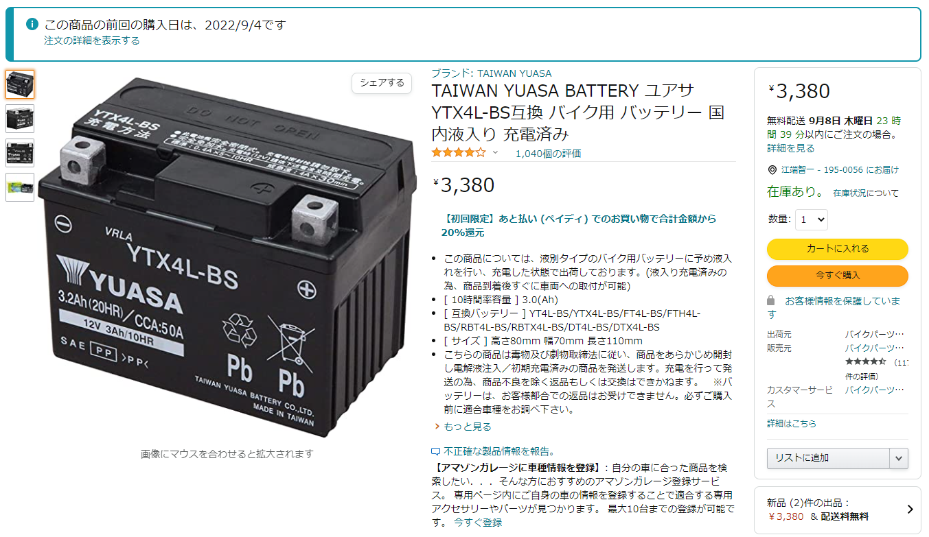 で、早速Amazonで購入。もっとも安いもので2000円、リチウムは16000円もするのでスコープ外として、今回はこれにしました。