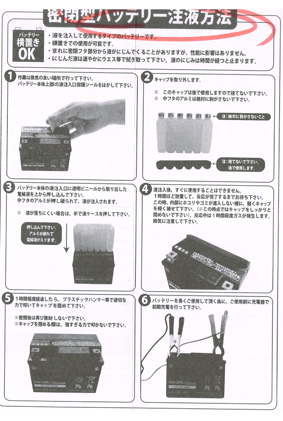 3000円程度であれば、今後もバッテリー交換を繰替えせば良いと思うけど、もしかしたら、バッテリー液交換(で遊ぶ)かもしれないので、自分の為に、マニュアルを添付しておきます。