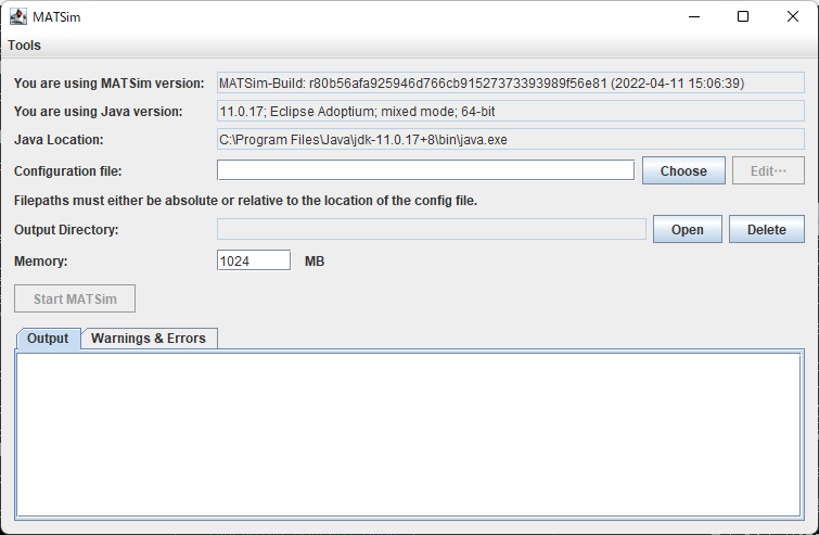 :\Users\tomoi\matsim-14.0>java -jar matsim-14.0.jar を起動すると、以下の画面が表示されます。
