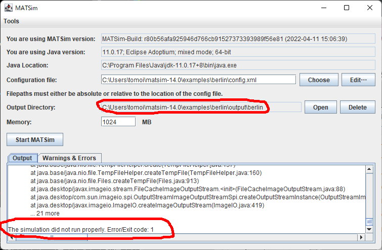 JDKのバージョンを確認してください。この問題は、jdk 17 以降で発生するようです。JDK11でmatsim-14.0.jarを動かしてみてください。がんばってください。