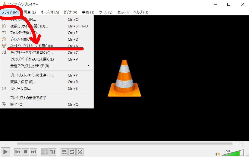 受信側Windows10(192.168.0.25)のVLCを立ち上げて、以下の操作を行う。