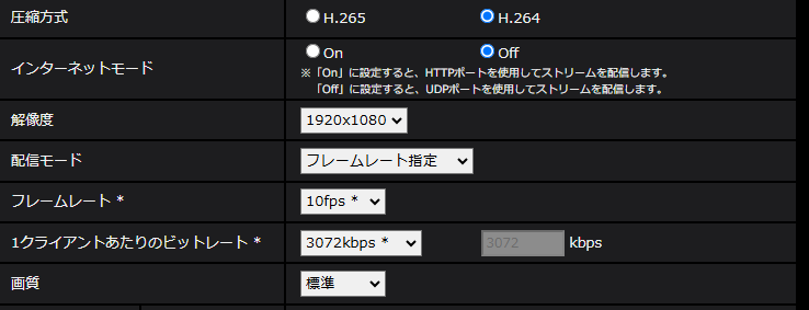 | 1クライアントあたりのビットレート | 最低値を超えるよう設定(推奨範囲:100~600kbps) |