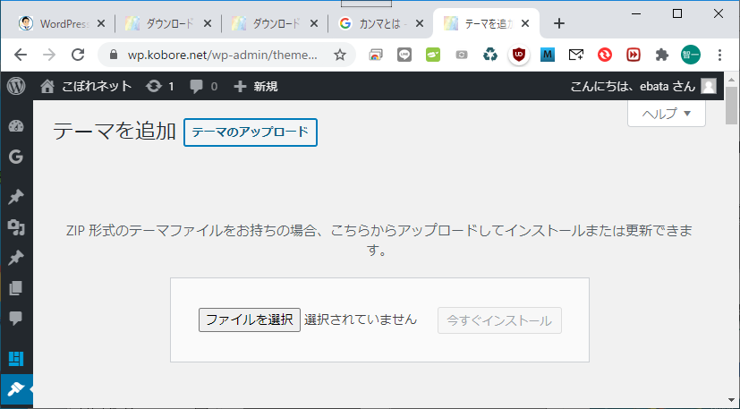 でもって、「外観」→「テーマ」→「新規追加」→「テーマのアップロード」で